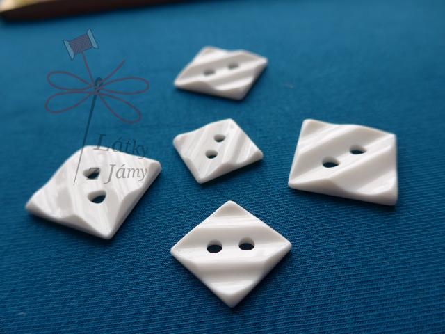Knoflík plastový bílý čtverec s vystouplými pruhy.