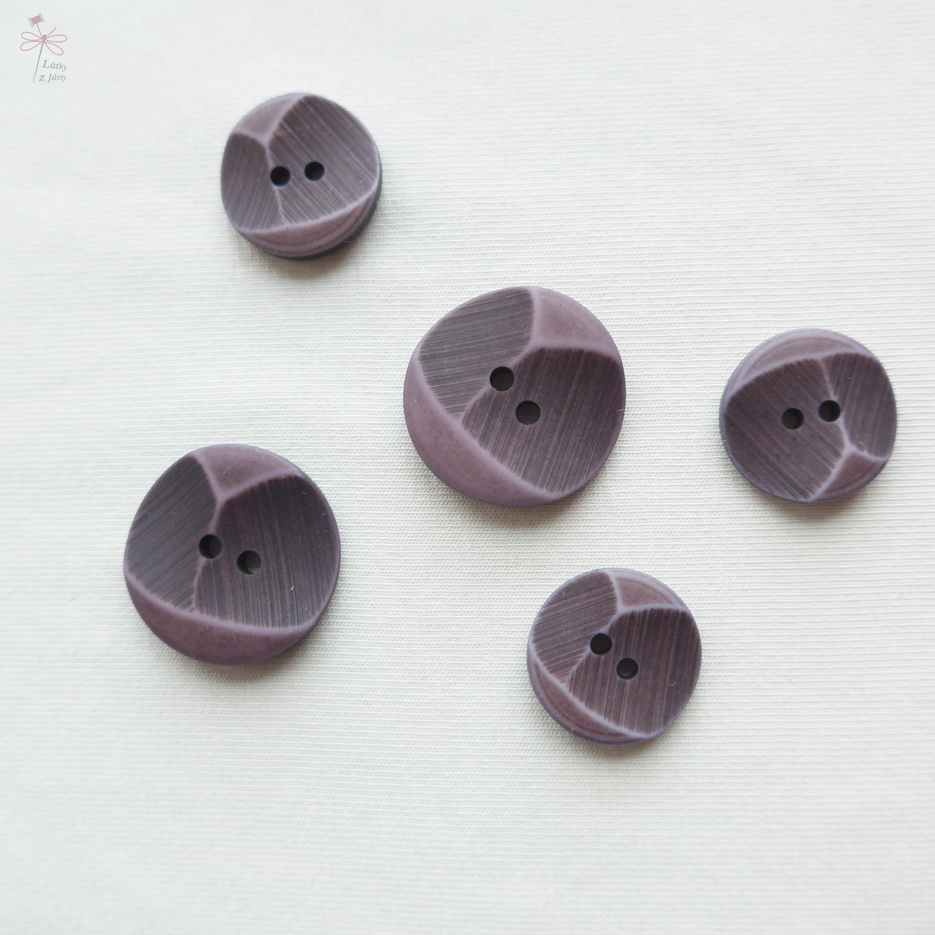Knoflík plastový fialový s prohlubněmi.