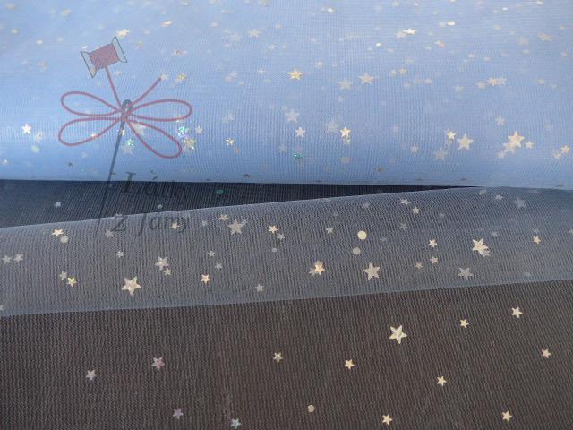 Tyl zdobí hvězdičky a puntíky s hologramem. Využijete ho na karnevaly, kostýmy, šití sukní apod. Je vhodný také na vánoční dekorace.