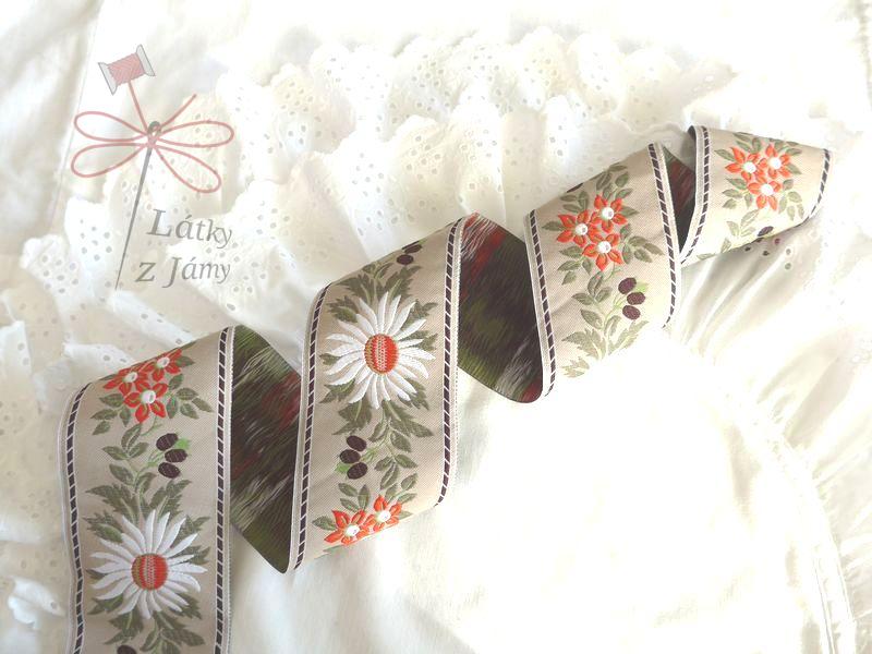 Stuha - Tmavě béžová bílý květ s červenýmiSkladem 2.7 m150 Kč/ m
