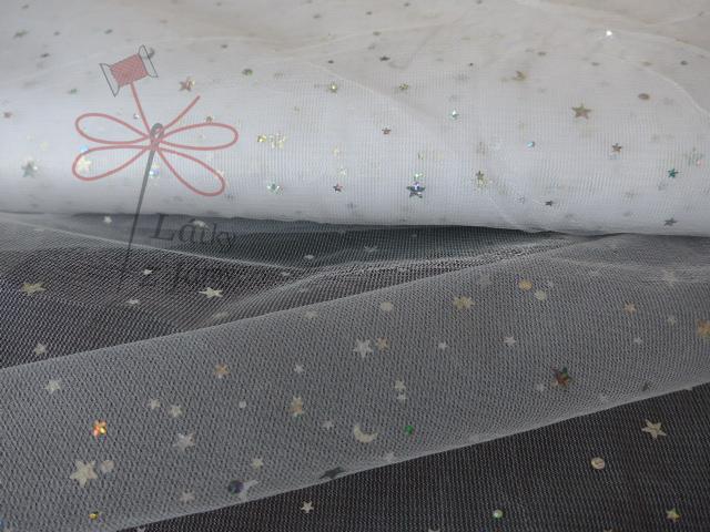 Tyl zdobí hvězdičky a puntíky s hologramem. Využijete ho na karnevaly, kostýmy, šití sukní apod. Je vhodný také na vánoční dekorace.